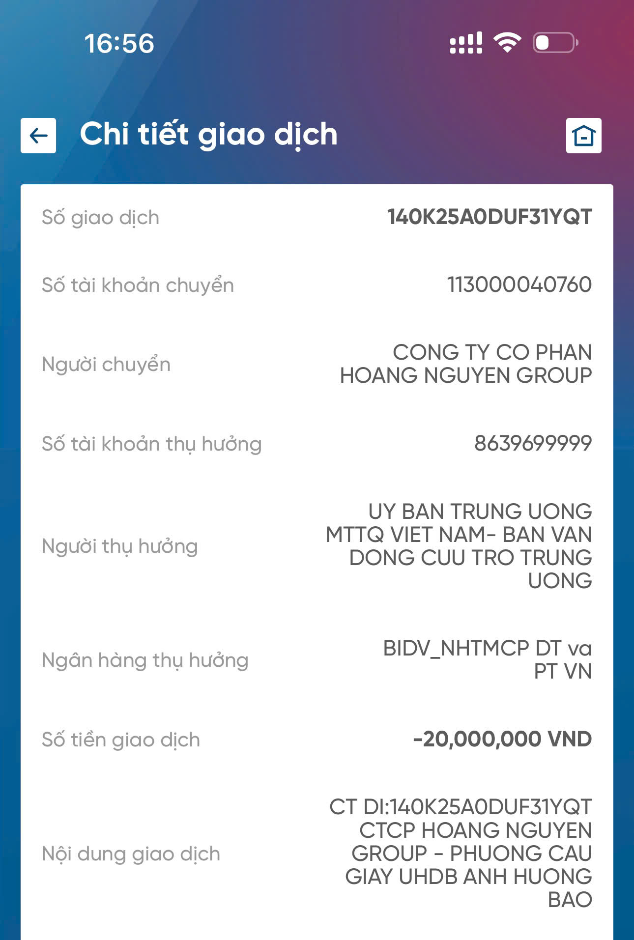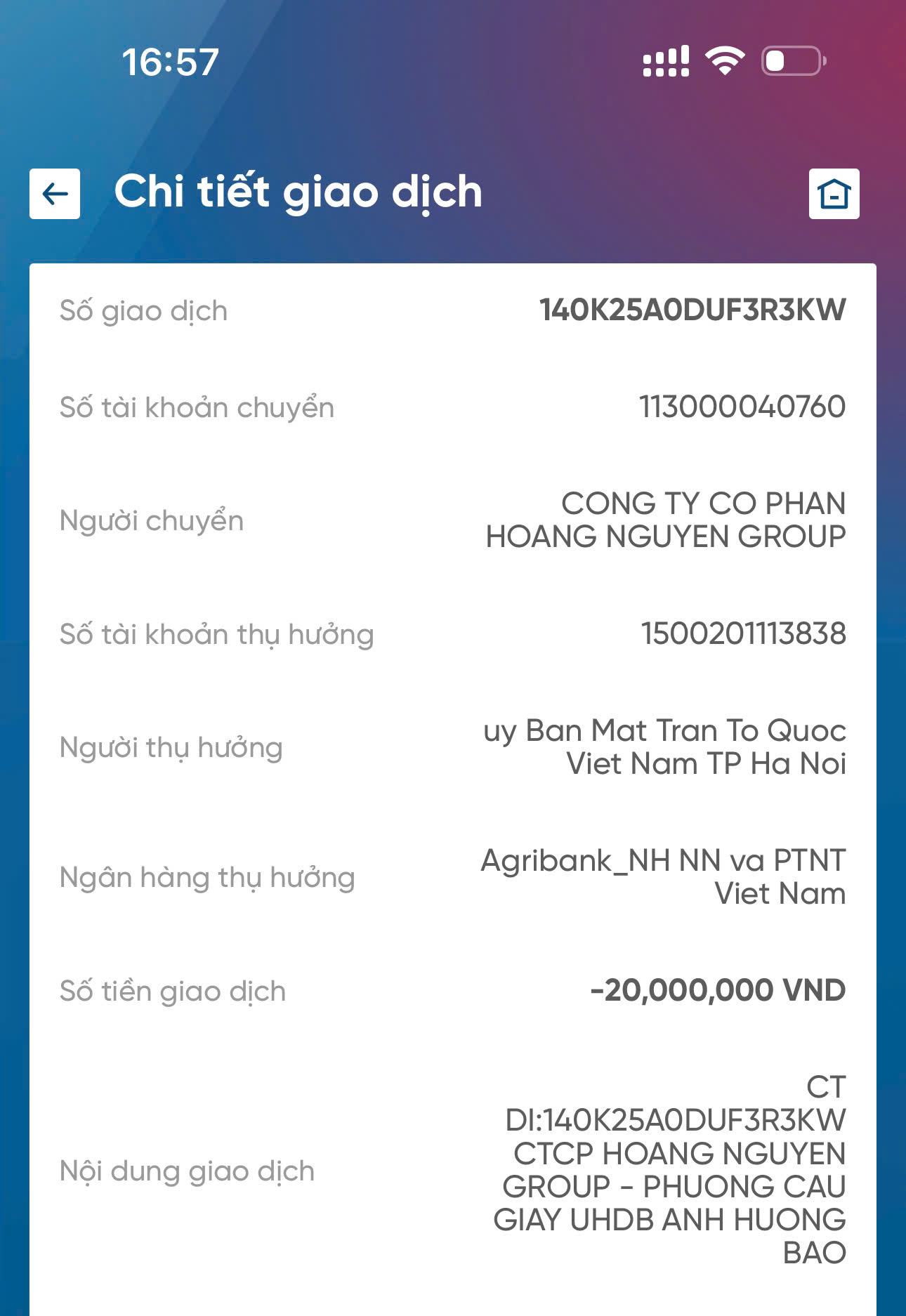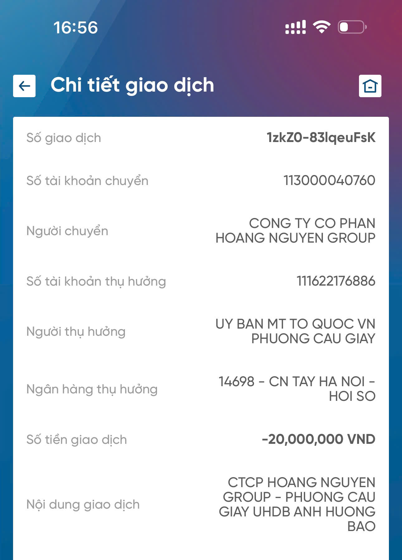 Tổng số tiền 60 triệu đồng đã được chuyển đến: